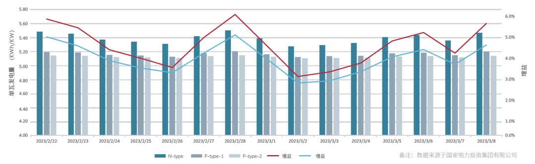 相较于常规P型PERC组件,搭载了先进TOPCo����� �������Ƴ������������ �������Ƴ������������ �������Ƴ������������ �������Ƴ�������n电池片技术的N型组件具备低衰减、低温度系数、����� �������Ƴ����������� �������Ƴ������������ �������Ƴ������������ �������Ƴ�������高双面率以及优异弱光性能等����� �������Ƴ������������ �������Ƴ������������ �������Ƴ������������ �������Ƴ�������优势,在发电量模拟中,可以在相同直流侧容����� �������Ƴ������������ �������Ƴ������������ �������Ƴ������������ �������Ƴ�������量下为项目带来至少3%的发电量增益。结����� �������Ƴ������������ �������Ƴ������������ �������Ƴ������������ �������Ƴ������合项目实际情况,项目地所属气候区夏季炎热,极端高����� �������Ƴ������������ �������Ƴ������������ �������Ƴ������������ �������Ƴ�������温可达41摄氏度,搭配良好的光照����� �������Ƴ������������ �������Ƴ������������ �������Ƴ������������ �������Ƴ�������条件届时组件工作温度将显著提升,影响功率输出。����� �������Ƴ������������ �������Ƴ������������ �������Ƴ������������ �������Ƴ�������N型TOPCon组件温度系数更低,����� �������Ƴ������������ �������Ƴ������������ �������Ƴ������������ �������Ƴ�������由P型的0.35%下降到了����� �������Ƴ������������ �������Ƴ������������ �������Ƴ����������� �������Ƴ�������0.29%,在高温环境温度下受影响更����� �������Ƴ������������ �������Ƴ������������ �������Ƴ������������ �������Ƴ�������小,展现出更优异的发电性能。同时,项目地处戈壁����� �������Ƴ����������� �������Ƴ������������ �������Ƴ������������ �������Ƴ�������,地面反射条件良好,冬季降����� �������Ƴ������������ �������Ƴ������������ �������Ƴ������������ �������Ƴ������雪可进一步提升地面反射率,搭配拥有更高双面率的����� �������Ƴ������������ �������Ƴ������������ �������Ƴ������������ �������Ƴ������N型TOPCon组件(双面率最����� �������Ƴ������������ �������Ƴ������������ �������Ƴ����������� �������Ƴ�������高可达85%)可以在相同的工况下带来更多背面����� �������Ƴ������������ �������Ƴ������������ �������Ƴ������������ �������Ƴ�������增益,提升发电总量。截取项目中N型与P����� �������Ƴ������������ �������Ƴ������������ �������Ƴ����������� �������Ƴ�������型发电阵列进行实际发电量对比����� �������Ƴ������������ �������Ƴ������������ �������Ƴ������������ �������Ƴ�������发现,相较于项目中的两个P型阵列,晶科能源Ti����� �������Ƴ����������� �������Ƴ������������ �������Ƴ������������ �������Ƴ�������ger Neo组件单千瓦发电量增益分别达到4.3����� �������Ƴ������������ �������Ƴ������������ �������Ƴ������������ �������Ƴ�������6%和5.12%,远超项目测算中的3%水平����� �������Ƴ����������� �������Ƴ������������ �������Ƴ��������